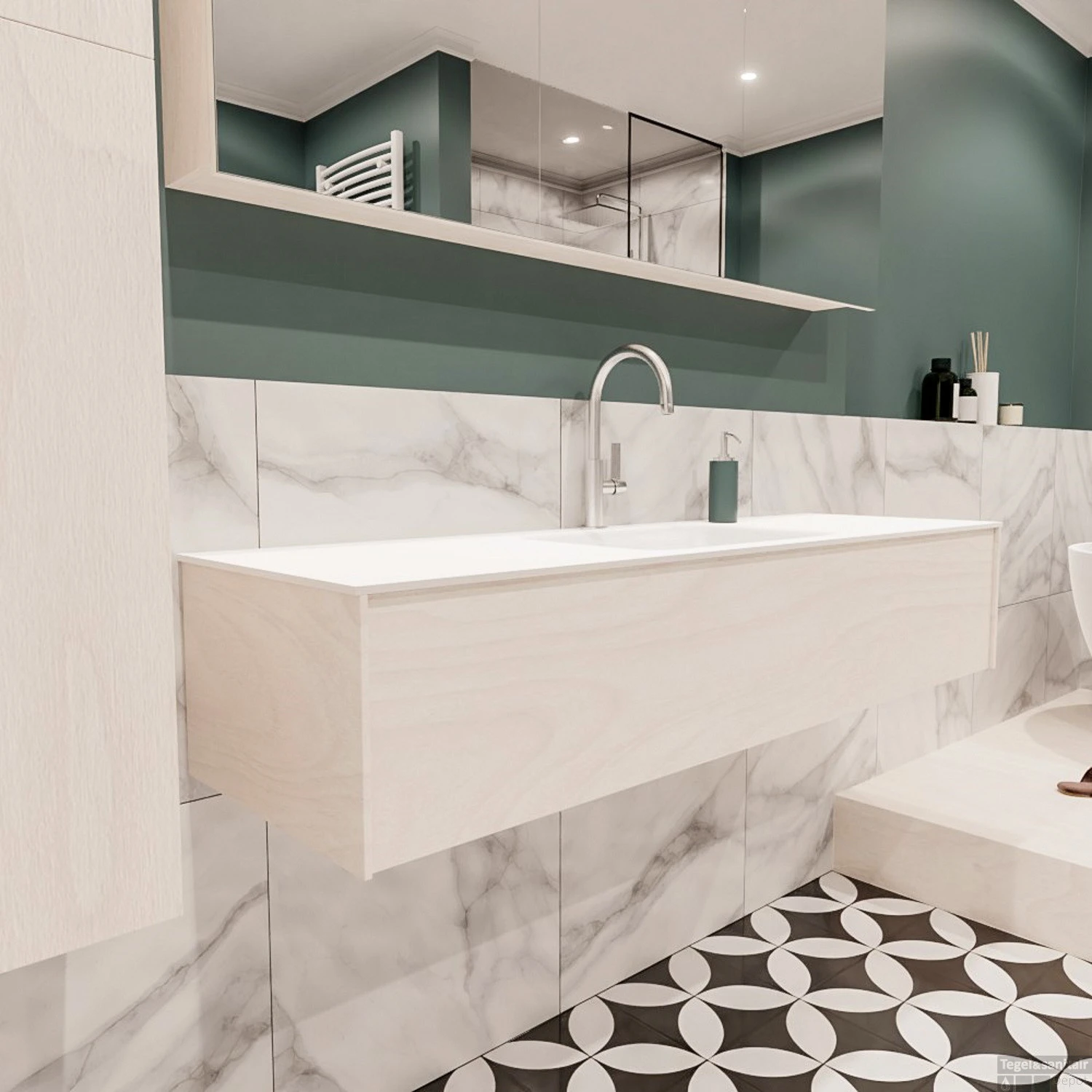Bovenop de onderkast bevestigt u de inbouw wastafel. Deze wastafel is wit van kleur en is gemaakt van solid surface. Solid surface is uitstekend geschikt om sanitaire producten van te maken omdat het geen poriën en naden heeft. Solid Surface is een composiet, geproduceerd uit mineralen en harsen. Bovendien is dit materiaal bestendig tegen vocht, vlekken, en zelfs chemische stoffen. Er trekt dus niets in, het is niet poreus, heeft een intense kleur én is gemakkelijk schoon te houden.