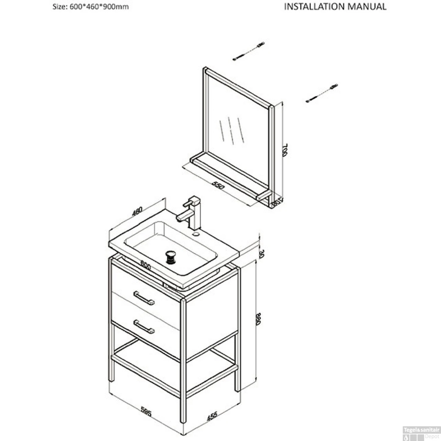 Het badmeubel heeft een breedte van 60 cm, een diepte van 46 cm en een hoogte van 90 cm. De industriële look van het meubel wordt benadrukt door het zwarte RVS frame om het meubel heen en de zwarte greepjes van de lades. Het wastafelblad is gemaakt van keramiek. Keramiek is een hard gebakken materiaal, vuil zal hier niet intrekken. Hierdoor is de wasbak makkelijk in onderhoud en zal hij zijn kleur behouden. Dit maakt keramiek dan ook een veel gebruikt materiaal in natte ruimtes.