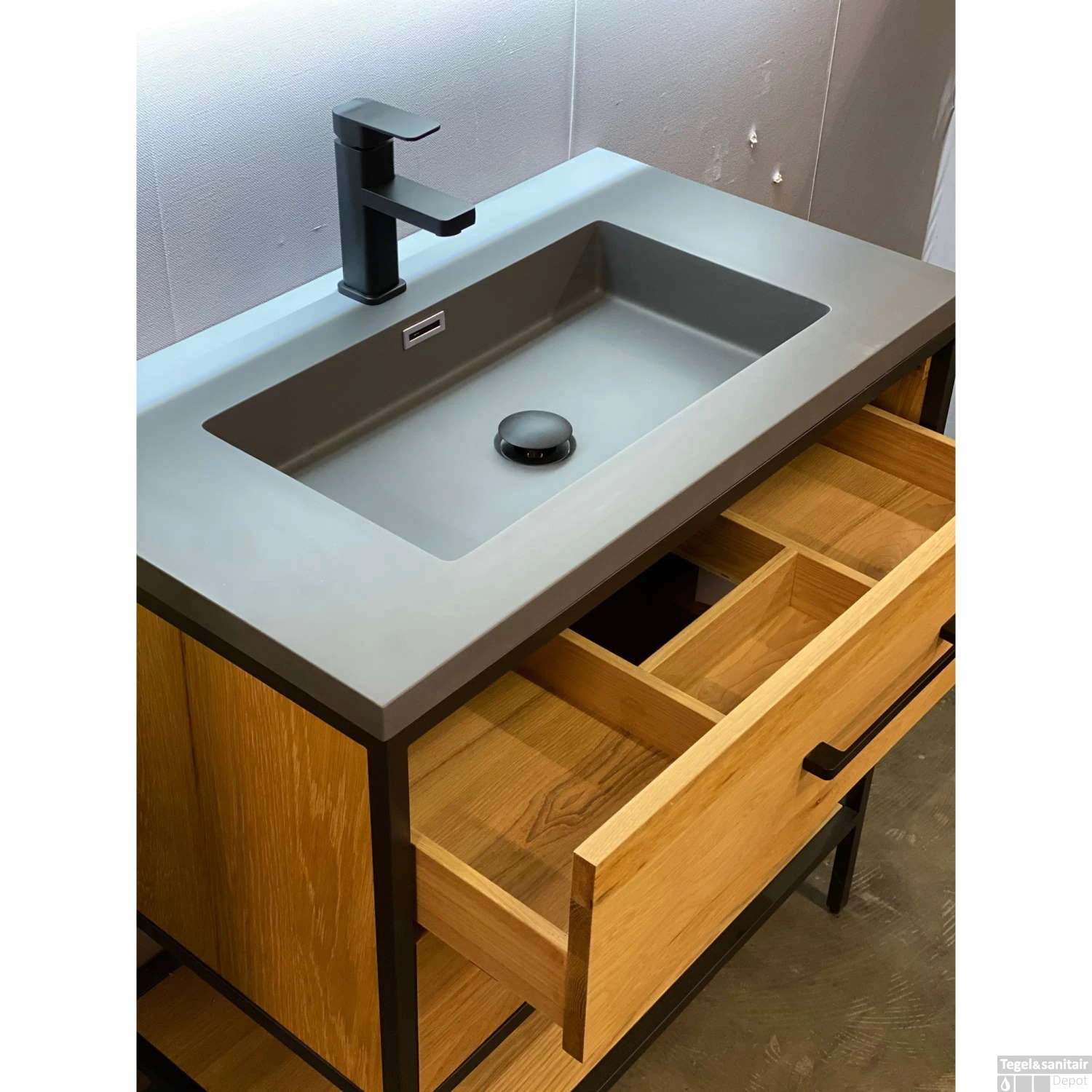 Het badmeubel heeft een breedte van 80 cm, een diepte van 46 cm en een hoogte van 90 cm. De industriële look van het meubel wordt benadrukt door het zwarte RVS frame om het meubel heen en de zwarte greepjes van de lades. Het wastafelblad is gemaakt van kunstmarmer. Kunstmarmer is een soort composiet door middel van kunstharsen waardoor het materiaal geen poriën bevat. Hierdoor is de wastafel waterdicht en kan vuil zich niet hechten.