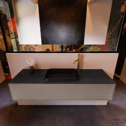 De inleg wastafel heeft een opstaande rand met een extra grote en diepe waskom. De ronde vormen van de waskom stralen een luxe zachtheid uit. De plek van de wastafelkraan op de hoek van de waskom geeft een extra speels effect. Het badmeubel van de set ERIN heeft een push to open lade. Zo heeft het badmeubel een mooie en gestroomlijnde uitstraling passend voor in elke badkamerstijl. Het badmeubel op deze afbeeldingen is de ERIN 200cm met onderkast in de kleur Cale met 2 lade(s). In deze serie hebben wij al meer dan 2500 variaties voor jou samengesteld.