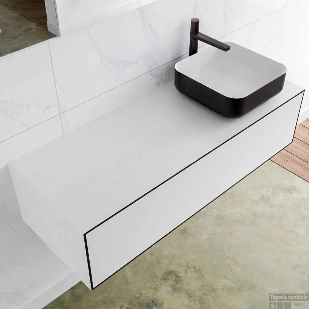 Badkamermeubelset Mondiaz LAGOM 120 cm Topblad met Rechtse Wastafel Solid Surface Opzetkom Binx met 1 Kraangaten Mat Zwart (2 laden)