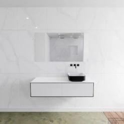 Het hangende badkamermeubel is gemaakt van solid surface. Dit meubel is 130 cm lang en heeft 2 laden die greeploos zijn. De laden kunnen worden geopend met een push-2-open systeem. De panelen zijn naadloos met elkaar verlijmd. Dit zorg voor een strakke en stijlvolle afwerking van uw badkamer.