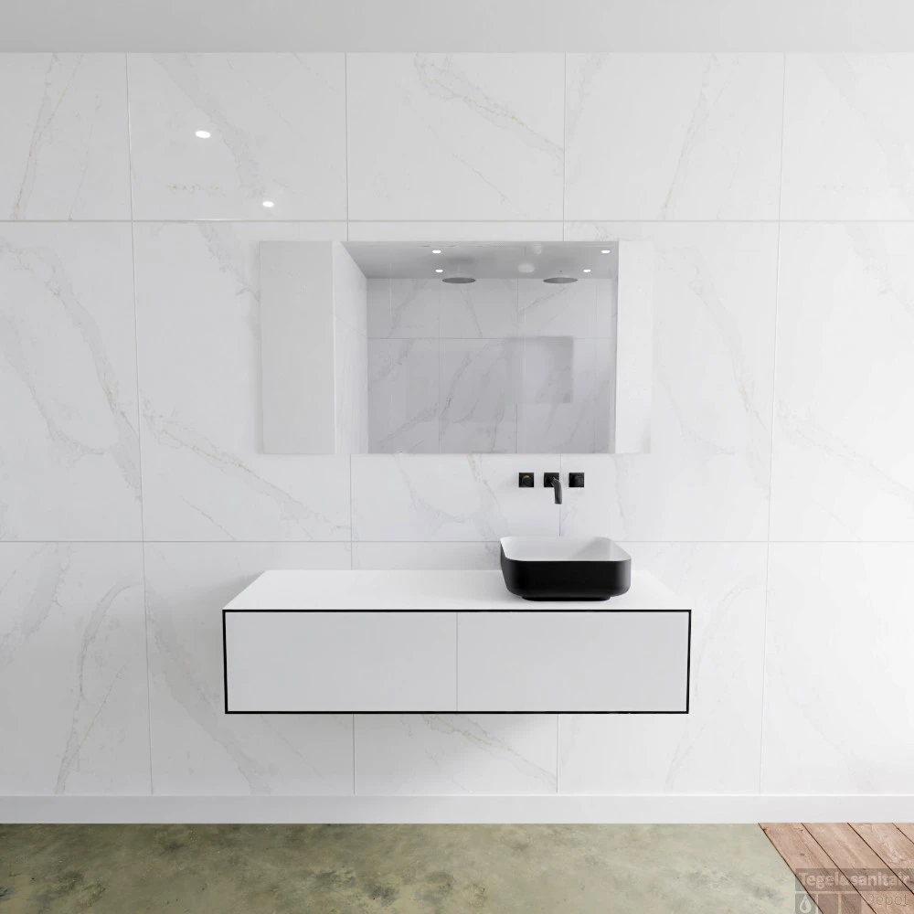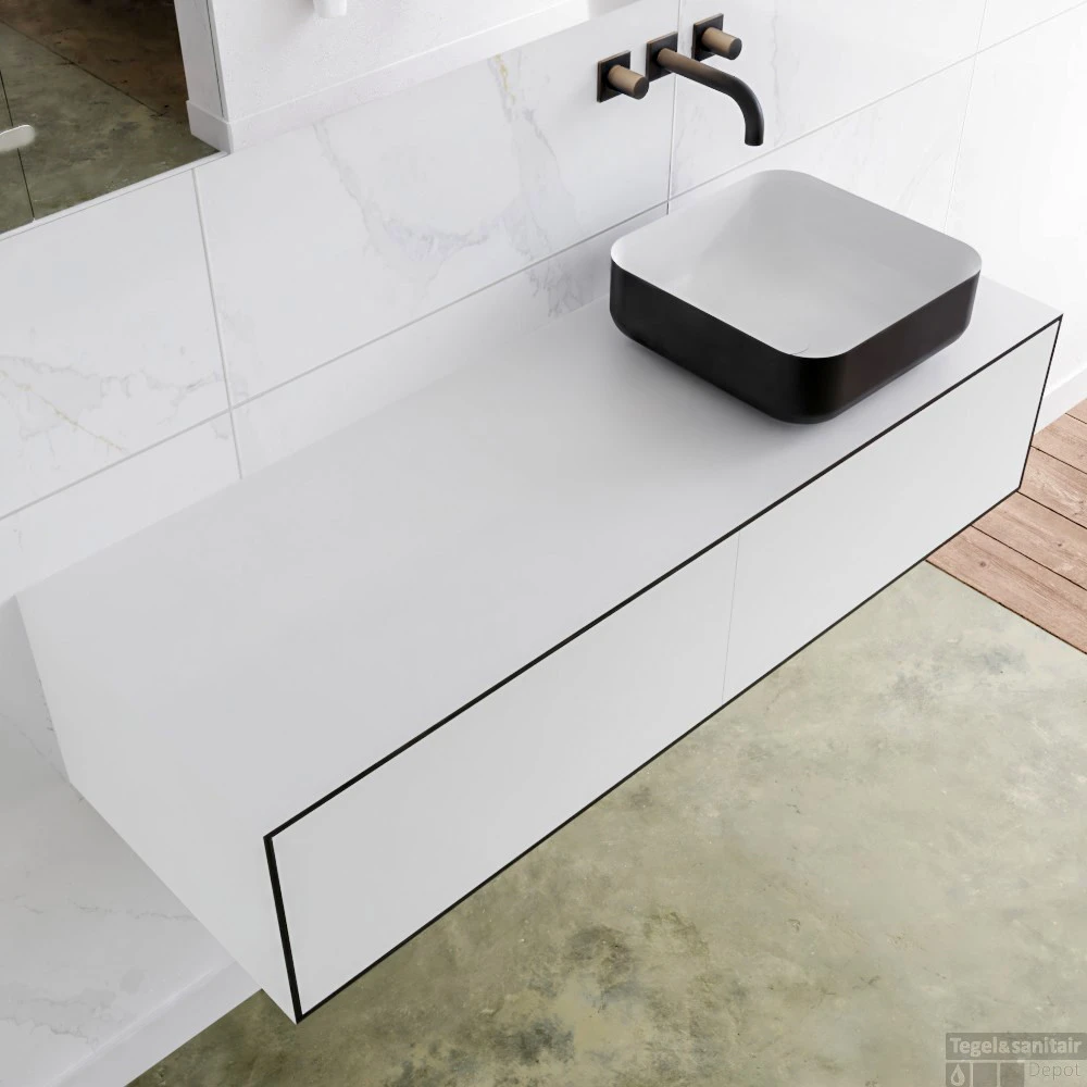 Badkamermeubelset Mondiaz LAGOM 130 cm Topblad met Rechtse Wastafel Solid Surface Opzetkom Binx Zonder Kraangaten Mat Zwart (2 laden)