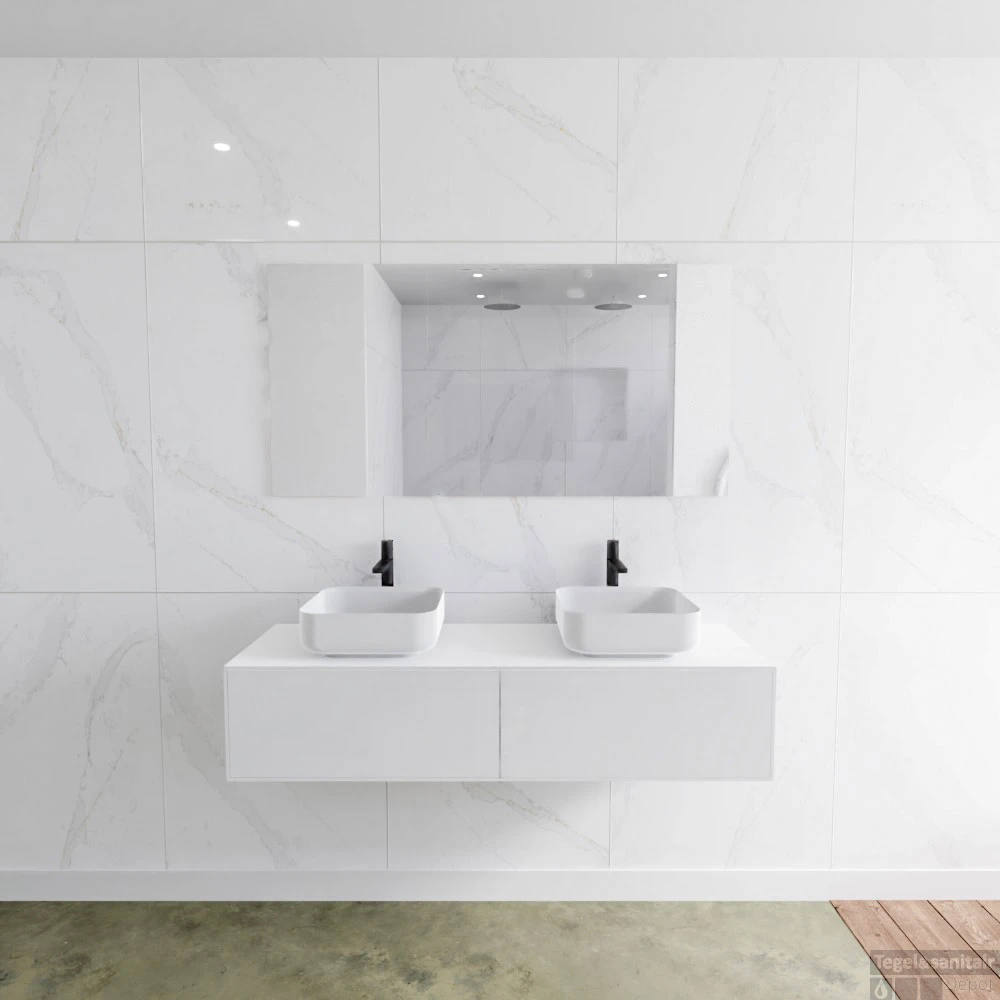 Badkamermeubelset Mondiaz LAGOM 140 cm met Topblad Dubbele Wastafel Solid Surface Opzetkom Binx Met 2 Kraangaten Mat Wit (2 laden)