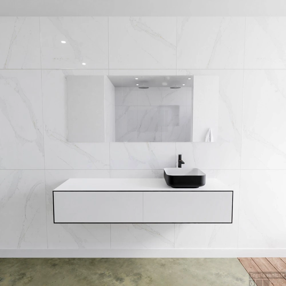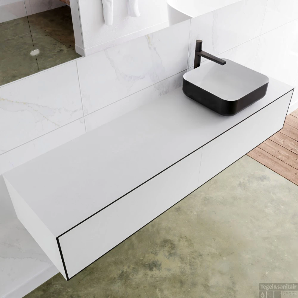 Badkamermeubelset Mondiaz LAGOM 160 cm Topblad met Rechtse Wastafel Solid Surface Opzetkom Binx met 1 Kraangat Mat Zwart (2 laden)