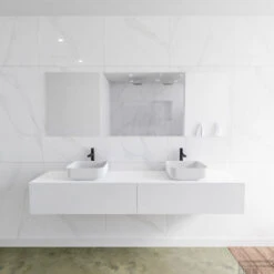 Het hangende badkamermeubel is gemaakt van solid surface. Dit meubel is 200 cm lang en heeft 2 lades die greeploos zijn. De lades kunnen worden geopend met een push-2-open systeem. De panelen zijn naadloos met elkaar verlijmd. Dit zorg voor een strakke en stijlvolle afwerking van uw badkamer.