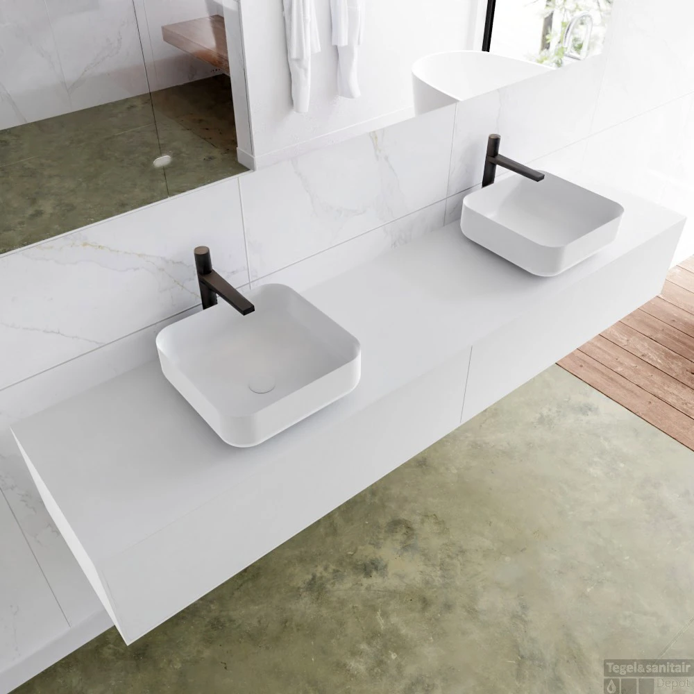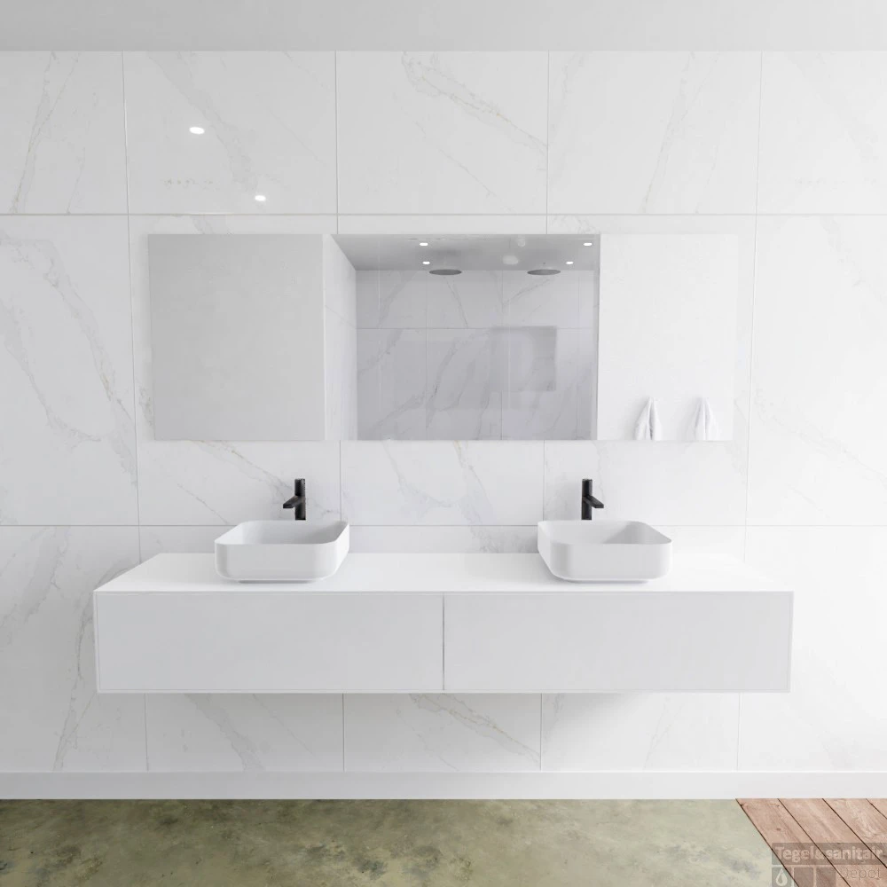 Badkamermeubelset Mondiaz LAGOM 200 cm met Topblad Dubbele Wastafel Solid Surface Opzetkom Binx Met 2 Kraangat Mat Wit (2 laden)