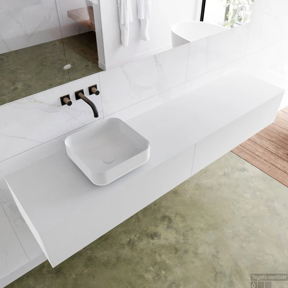 De wastafel is een opzetkom in model Binx zonder kraangat en is gemaakt van solid surface.