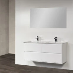 U heeft in deze set, tegen een meerprijs, keuze uit een bijpassende wastafel, spiegel(-kast), spiegelverwarming, spiegelverlichting en/of een hoge kast.