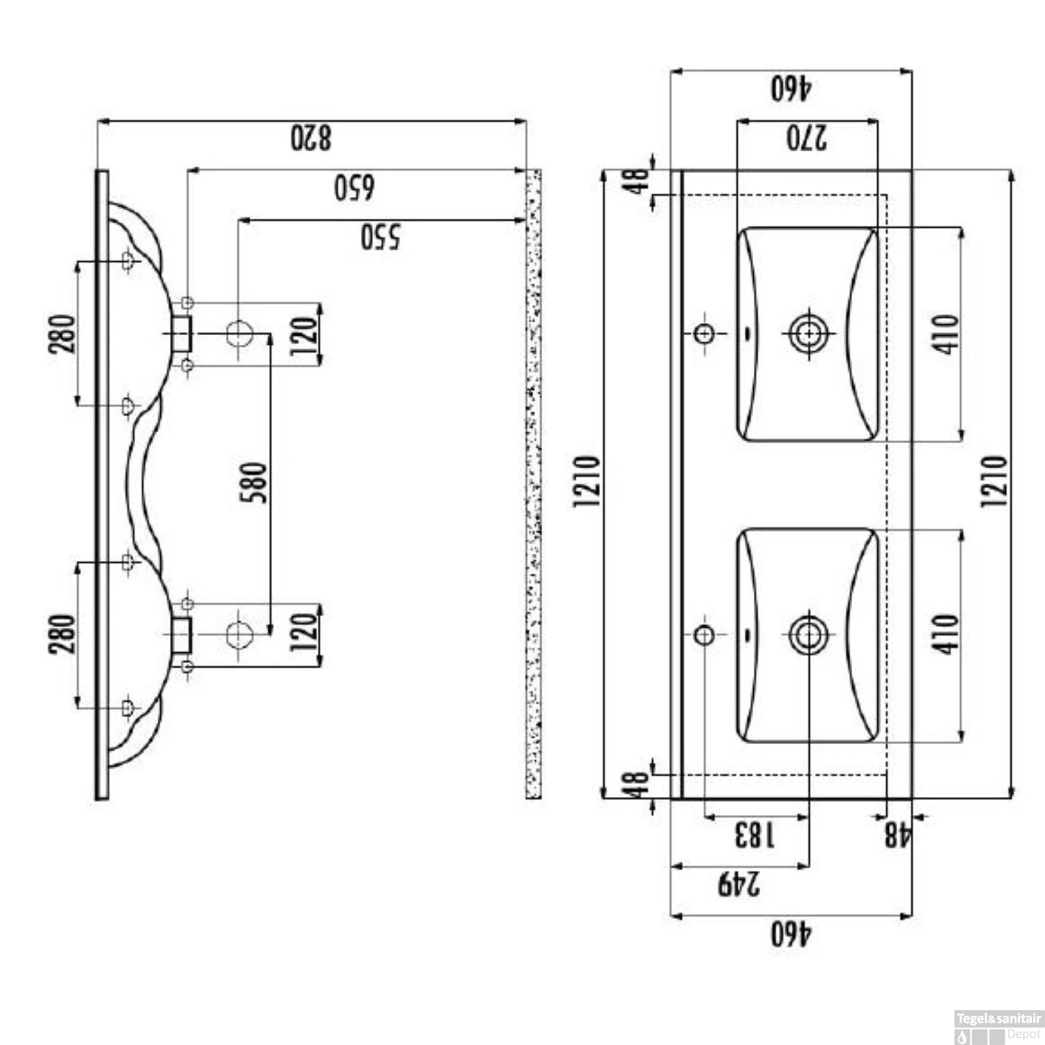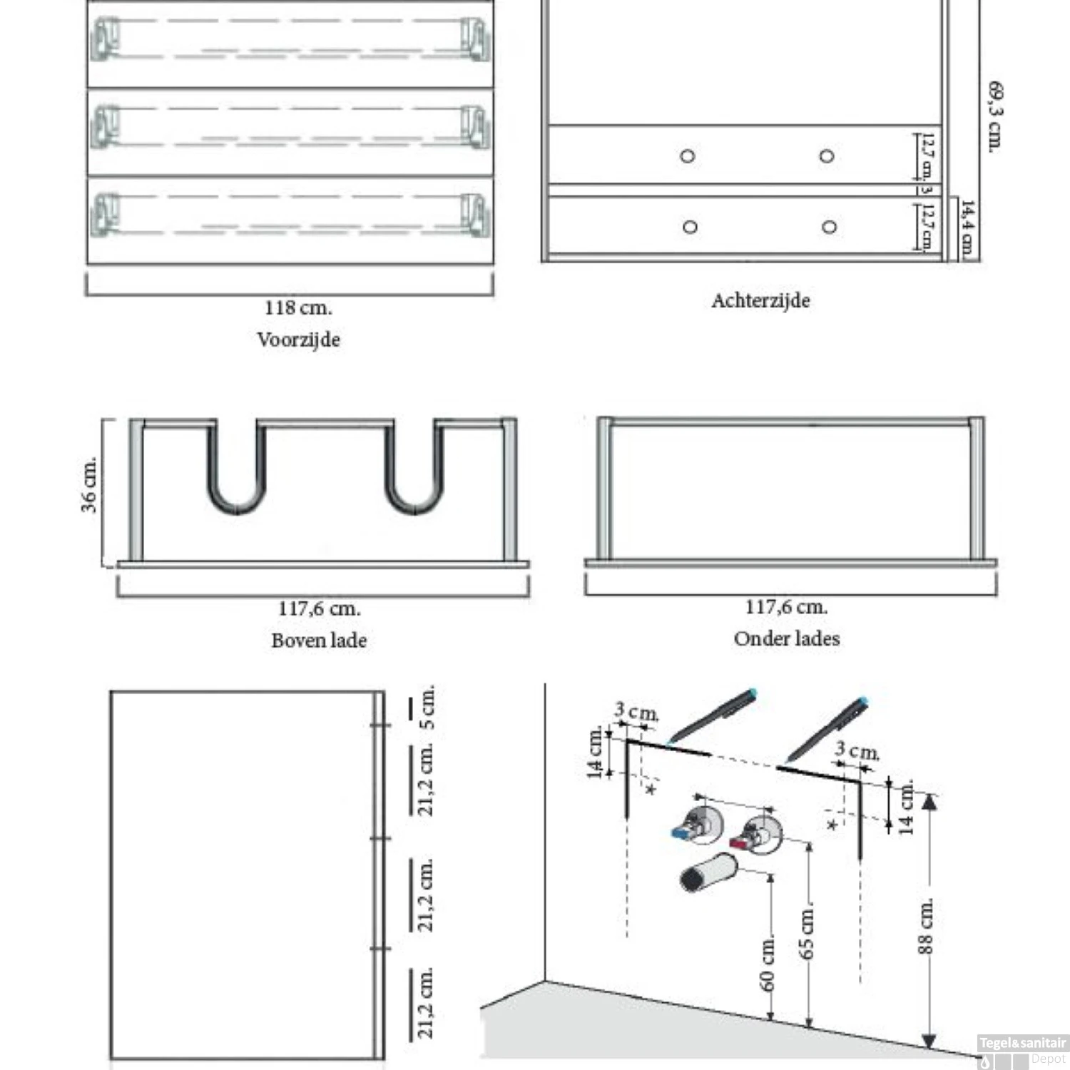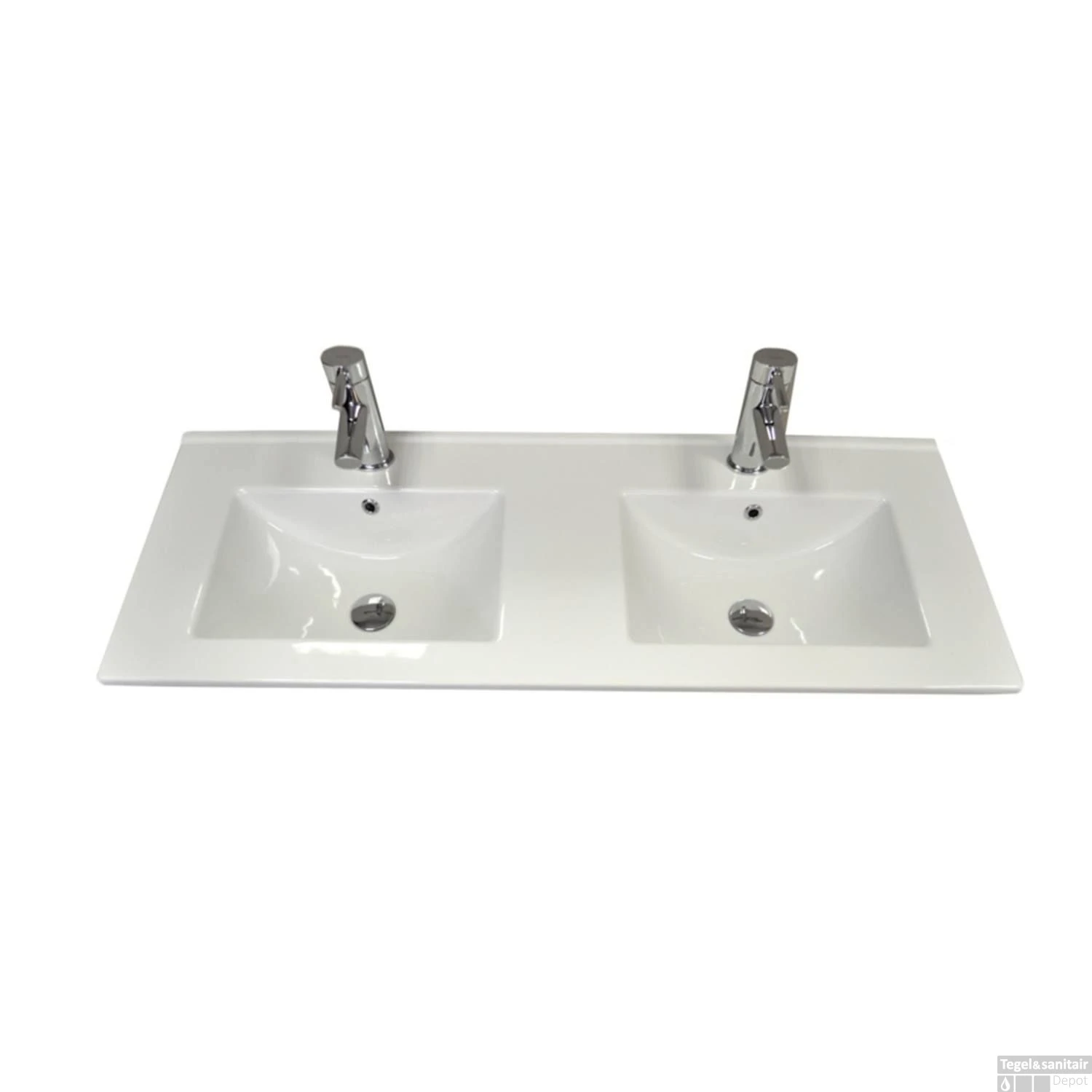 Dit badmeubel is uitgerust met 2 kraangaten, zodat u 2 opbouwkranen aan het meubel kunt toevoegen. De opbouw kranen worden geplaatst op het ruime wastafelblad met 2 wastafels, waarmee u geen ruzie meer hoeft te maken tijdens het tandenpoetsen. Het wastafelblad is gemaakt van keramiek en beschikt over een overloop. De onderkast is gemaakt van MDF en heeft een rechthoekige vorm met zijn afmeting van 121×46 cm.
