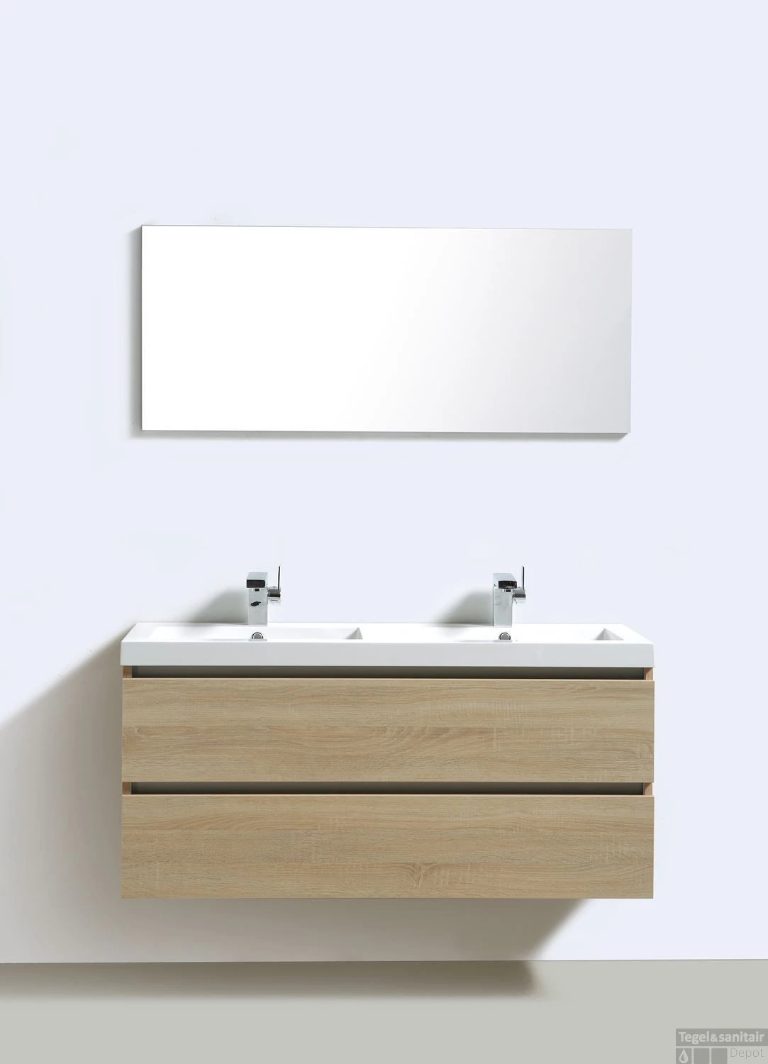 De onderkast heeft een breedte van 120 cm, een diepte van 47 cm en een hoogte van 50 cm en is afgewerkt in de kleur light wood. Bij de set hoort een dubbele wastafel met een breedte van 120 cm, een diepte van 47 cm en een hoogte van 5 cm. De wastafel is gemaakt van mineraalmarmer en beschikt over twee wasbakken met een overloop. Ook vindt u twee kraangaten bij de dubbele wastafel. Om het meubel compleet te maken kunt u kiezen uit diverse spiegels.