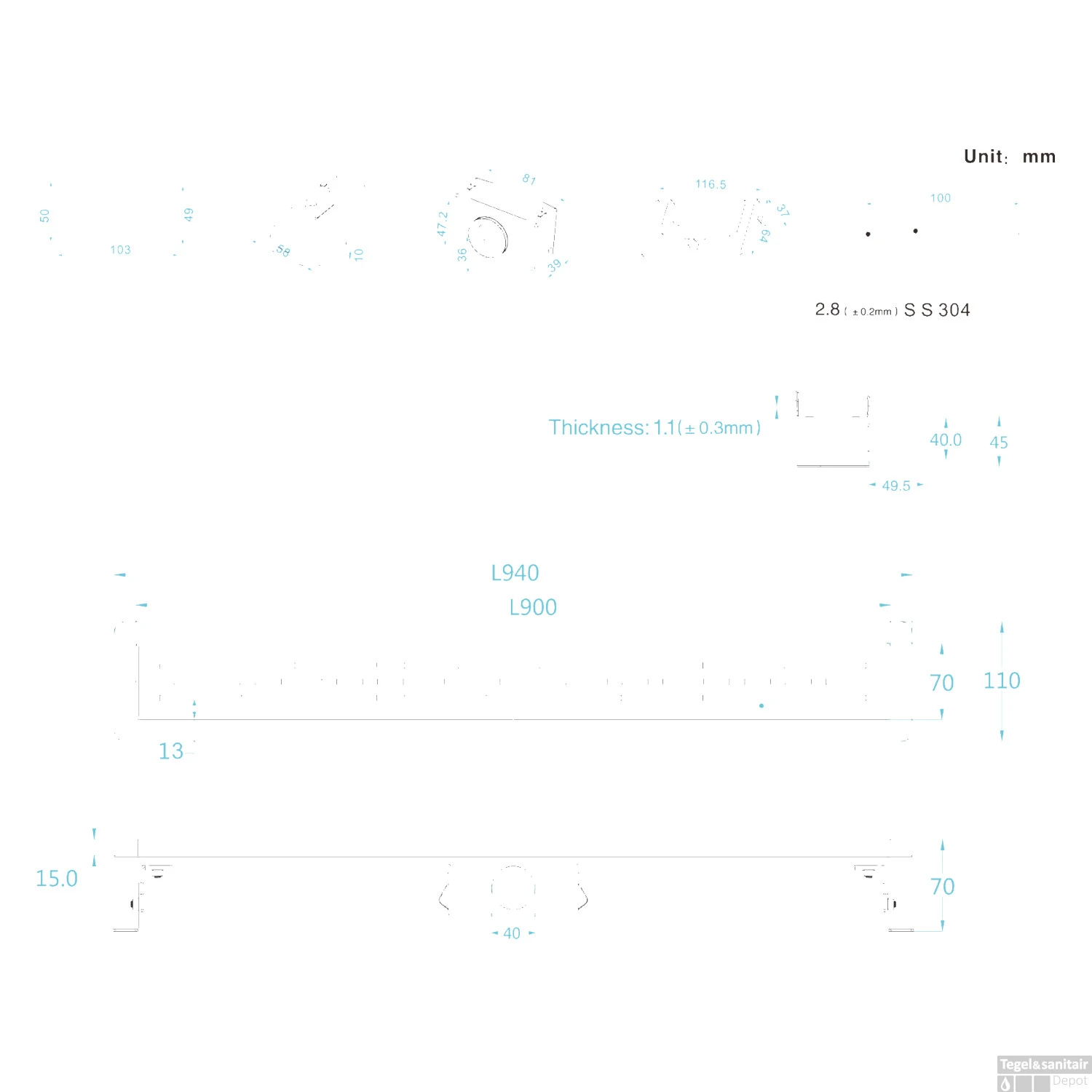 Er wordt een waterdicht membraan meegeleverd en is voorzien van stelpoten om de goot waterpas te kunnen zetten voor dat u begint met tegelen.