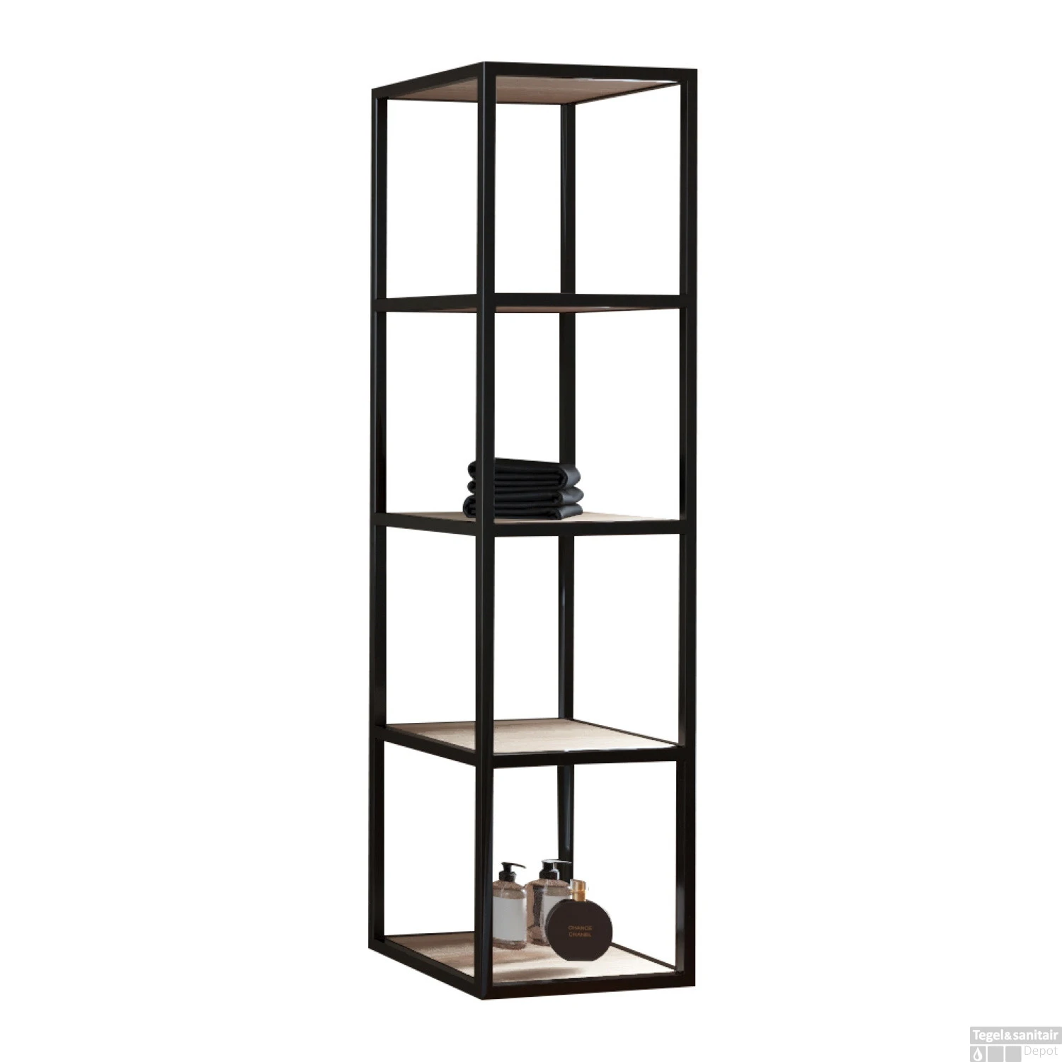 Met de kolomkast van Boss & Wessing uti de Harper serie maakt u uw badkamer helemaal compleet. De open vakken kast heeft een hoogte van 135 cm, een breedte van 35 cm en een diepte van 35 cm. De kast is uitgevoerd in een zwart metalen frame, met daarnaast noten kleurige planken.