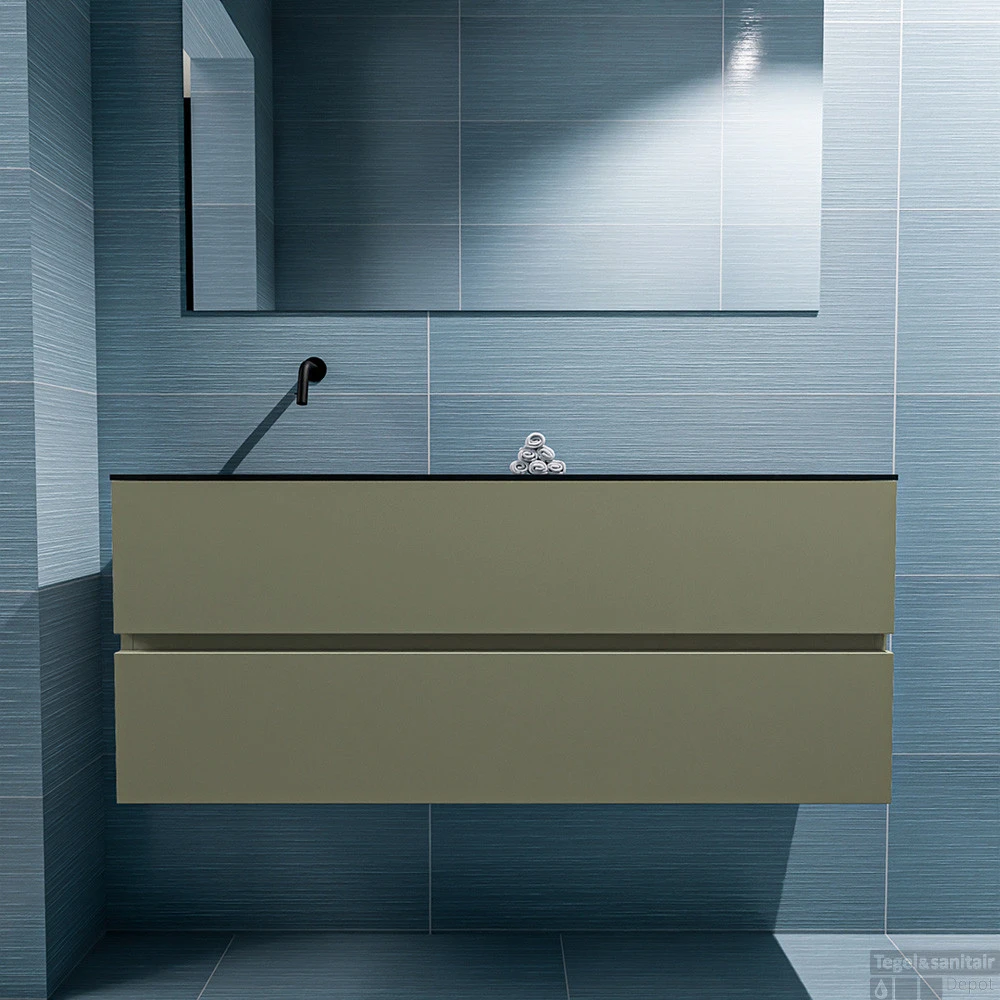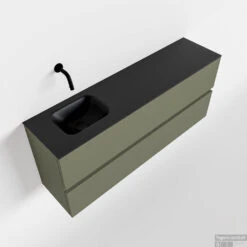 Geef jouw toilet een upgrade met de populaire toiletmeubel serie ADA! Hier zie je de vrijhangende onderkast ADA van 120cm breed met 2 lades in de kleur army en een solid surface wastafel model LEX in de kleur Urban. De positie van de spoelbak is links zonder kraangat. In deze toiletmeubel serie hebben wij al meer dan 600 variaties samengesteld! Daarnaast is maatwerk mogelijk.