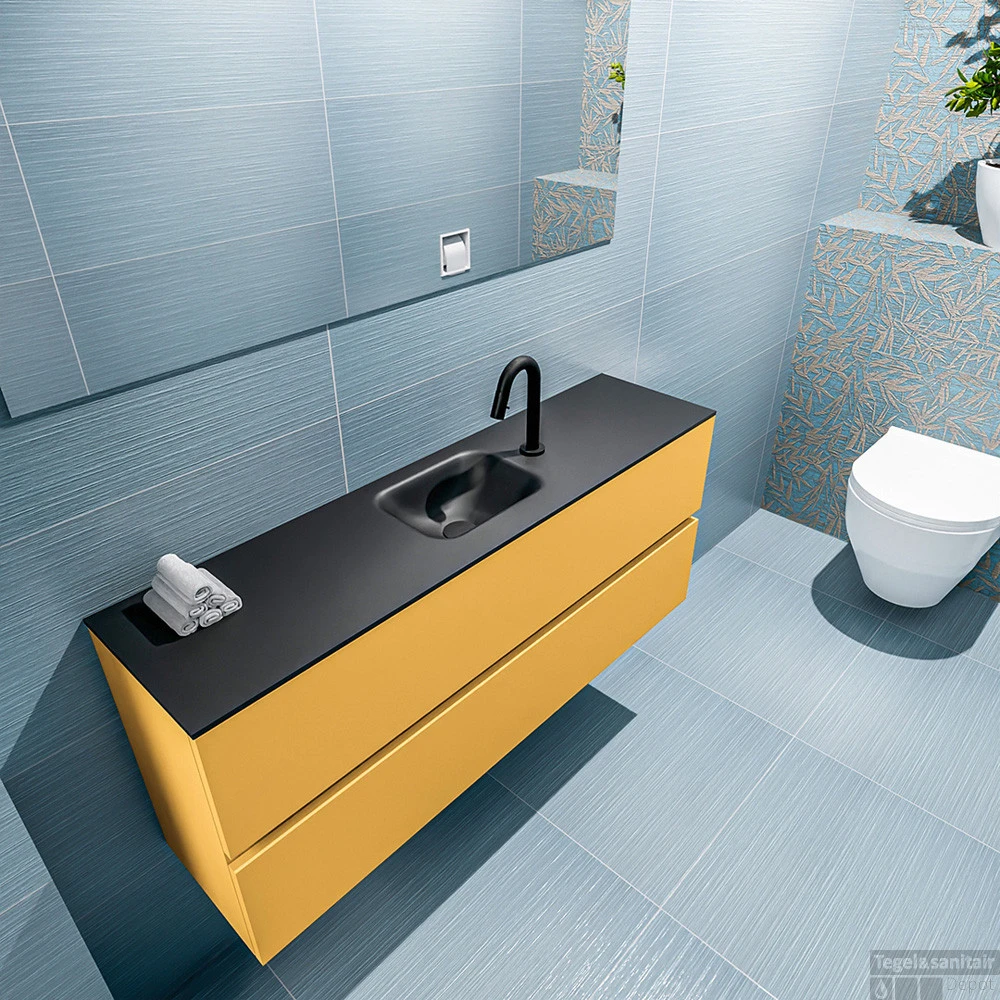 Geef jouw toilet een upgrade met de populaire toiletmeubel serie ADA! Hier zie je de vrijhangende onderkast ADA van 120cm breed met 2 lades in de kleur ocher en een solid surface wastafel model LEX in de kleur Urban. De positie van de spoelbak is midden 1 kraangat. In deze toiletmeubel serie hebben wij al meer dan 600 variaties samengesteld! Daarnaast is maatwerk mogelijk.