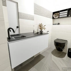 Geef jouw toilet een upgrade met de populaire toiletmeubel serie ADA! Hier zie je de vrijhangende onderkast ADA van 60cm breed met 2 lades in de kleur ocher en een solid surface wastafel model LEX in de kleur Urban. De positie van de spoelbak is links zonder kraangat. In deze toiletmeubel serie hebben wij al meer dan 600 variaties samengesteld! Daarnaast is maatwerk mogelijk.