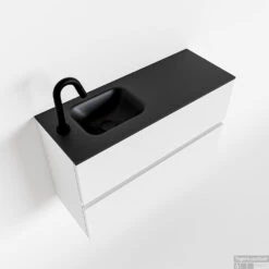 Geef jouw toilet een upgrade met de populaire toiletmeubel serie ADA! Hier zie je de vrijhangende onderkast ADA van 80cm breed met 2 lades in de kleur talc en een solid surface wastafel model LEX in de kleur Urban. De positie van de spoelbak is links 1 kraangat. In deze toiletmeubel serie hebben wij al meer dan 600 variaties samengesteld! Daarnaast is maatwerk mogelijk.