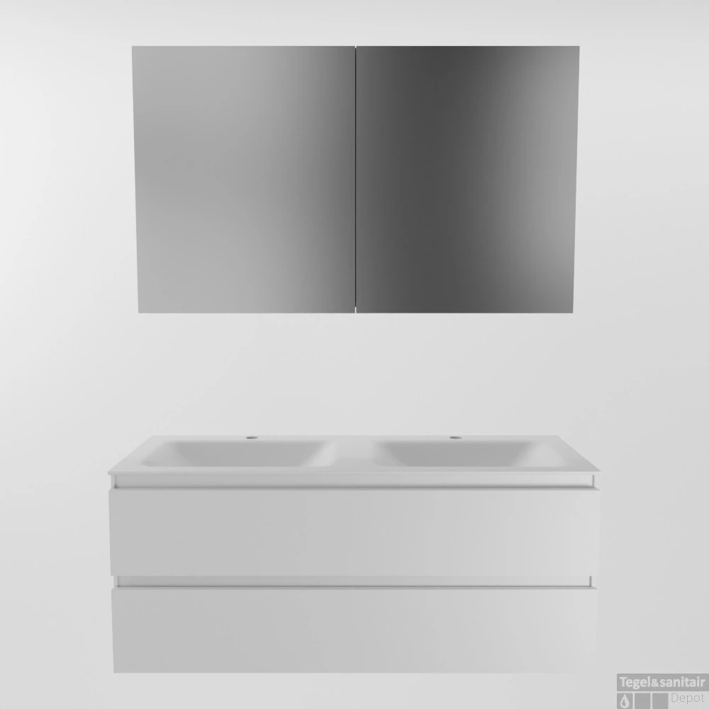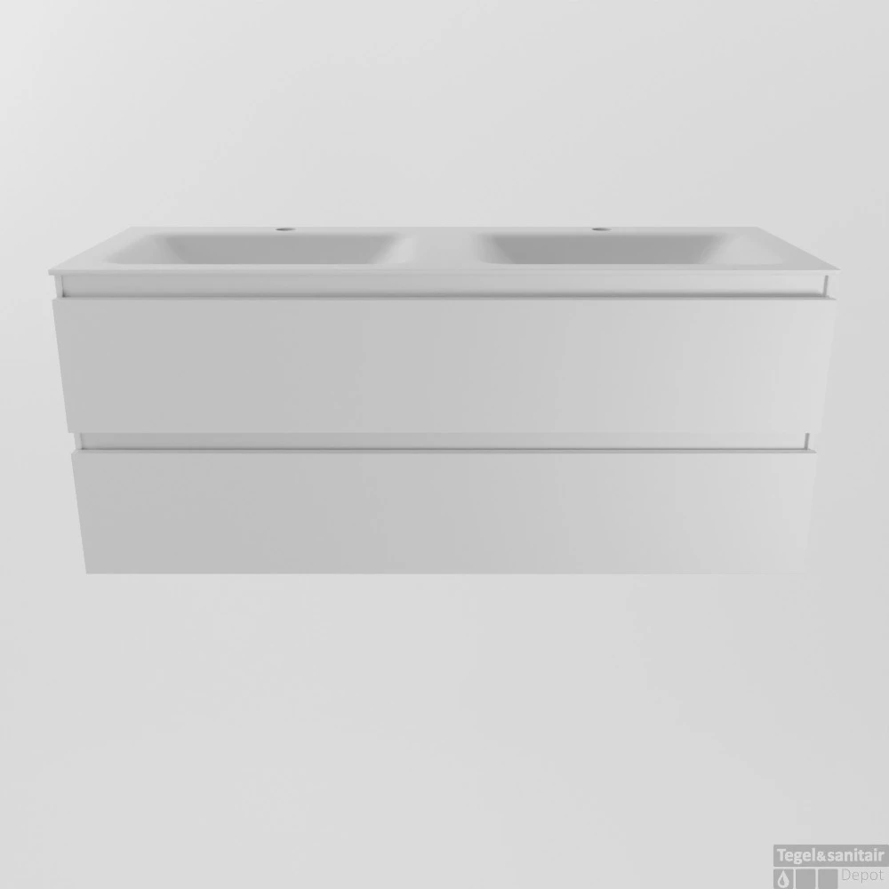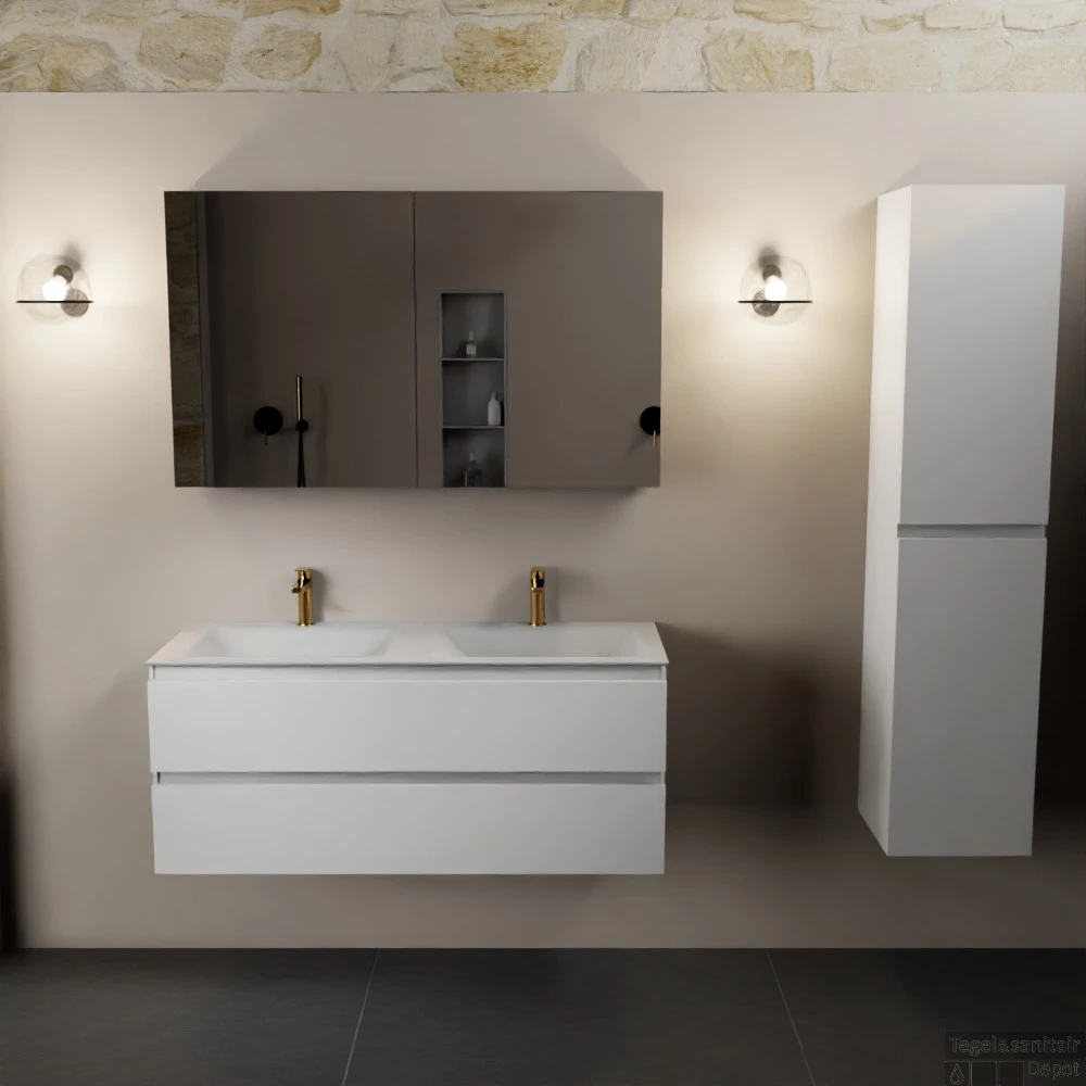 Met badkamermeubels set AIVY heeft u eindeloos veel opties om uw badkamer helemaal naar uw wensen in te vullen. En kunt u van uw badkamer een “formidabele” badkamer maken waar u heerlijk kunt genieten. U ziet hier AIVY 120cm badkamermeubel in de kleur Talc met 2 lades. De AIVY -onderkasten zijn verkrijgbaar in 4 kleuren. De 2 prachtige houttinten melamines Mocha en Chai met een voelbare houtstructuur en 2 effen gespoten kleuren MDF mat wit en matzwart. De AIVY wastafels zijn te krijgen in 2 kleuren Solid Surface, matzwart en mat wit, met de keuze wel of geen kraangaten en DENIA keramisch wit glanzende wastafel is standaard met kraangaten.