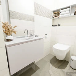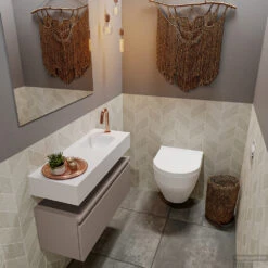 Geen ruimteverlies met deze moderne zwevende toiletmeubel ANDOR! Op de afbeelding zie je de vrijhangende wastafel LEX in 100cm breed in de kleur talc met een bijpassende badmeubel in de kleur army. De positie van de spoelbak is rechts 1 kraangat. In deze toiletmeubel serie hebben wij al meer dan 950 variaties samengesteld! Daarnaast is maatwerk mogelijk.