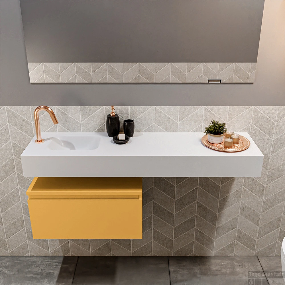 Geen ruimteverlies met deze moderne zwevende toiletmeubel ANDOR! Op de afbeelding zie je de vrijhangende wastafel LEX in 120cm breed in de kleur talc met een bijpassende badmeubel in de kleur ocher. De positie van de spoelbak is links 1 kraangat. In deze toiletmeubel serie hebben wij al meer dan 950 variaties samengesteld! Daarnaast is maatwerk mogelijk.