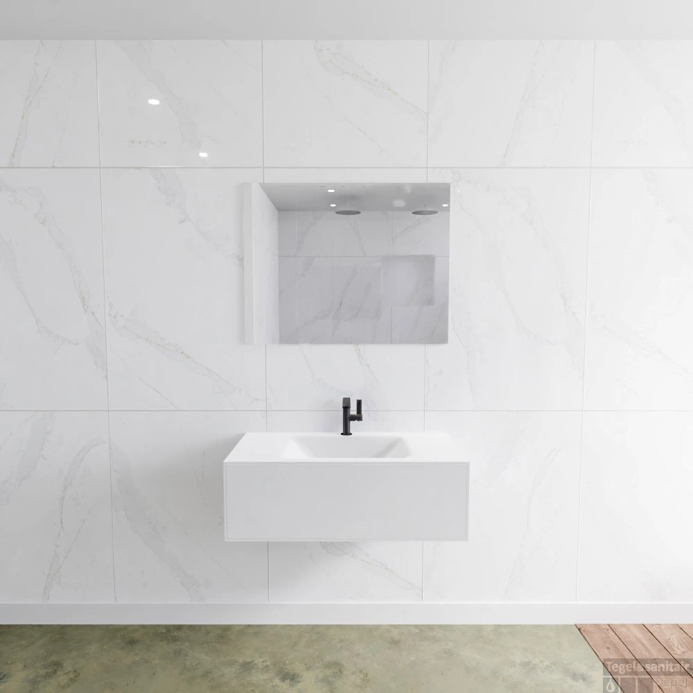 Zowel de ombouw, wastafel als het voorpaneel zijn van SOLID SURFACE. Je ziet hier de combinatie LAGOM 90cm badkamermeubel in de kleur talc met 1 lade. Wij hebben voor jouw gemak meer als 400 van de populairste combinaties toegevoegd. Alsof dat nog niet genoeg is kun je zelf bij de badkameronderkast meer als 65 duizend combinaties maken. De populaire meubels zijn samengesteld uit: