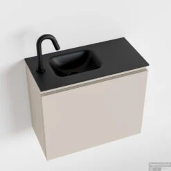 Een mooie combinatie van elegant en rustiek krijg je met het toiletmeubel OLAN! Wat je hier ziet is de vrijhangende onderkast OLAN in 60cm breed met 1 lade in de kleur linen en een solid surface wastafel model LEX in de kleur urban. De positie van de spoelbak is links 1 kraangat. In deze toiletmeubel serie hebben wij al meer dan 680 variaties samengesteld! Daarnaast is maatwerk mogelijk.