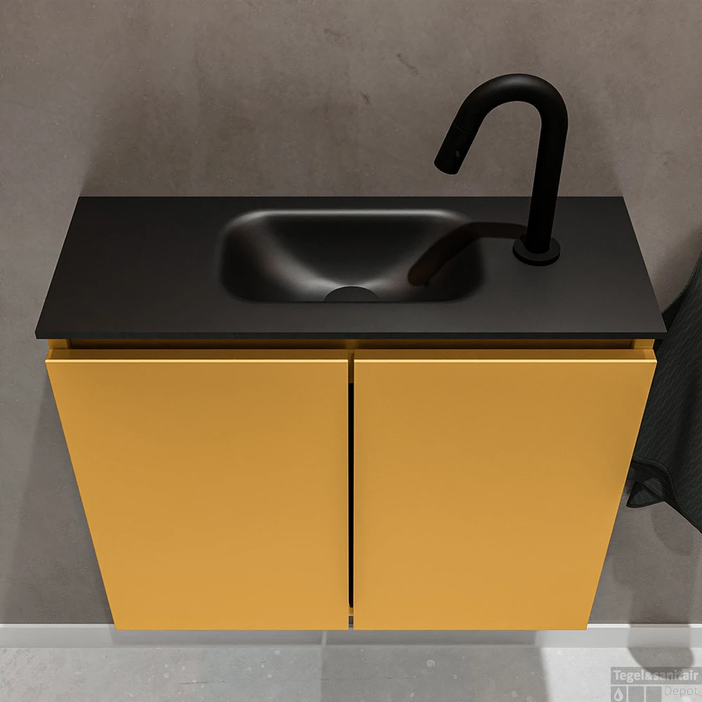 Moderniseer jouw toilet met dit toiletmeubel TURE! Het gaat hier om de vrijhangende onderkast TURE in 60cm breed met 2 deuren in de kleur ocher en een solid surface wastafel model EDEN in de kleur urban. De positie van de spoelbak is midden 1 kraangat. In deze toiletmeubel serie hebben wij al meer dan 680 variaties samengesteld! Daarnaast is maatwerk mogelijk.