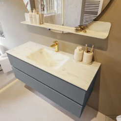 Of u kiest voor kleur of een houtlook, een speciale maat badmeubel, wel of geen kraangaten de badkamermeubel set Vica heeft het allemaal. U heeft bij de Vica badkamermeubel set de keuze uit 3 modellen wastafels de CLOUD en de MOON in Solid Surface met de opties de waskom rechts, links, midden of dubbel en wel of geen kraangaten. En de DENIA keramische wastafel met de opties midden en dubbel.