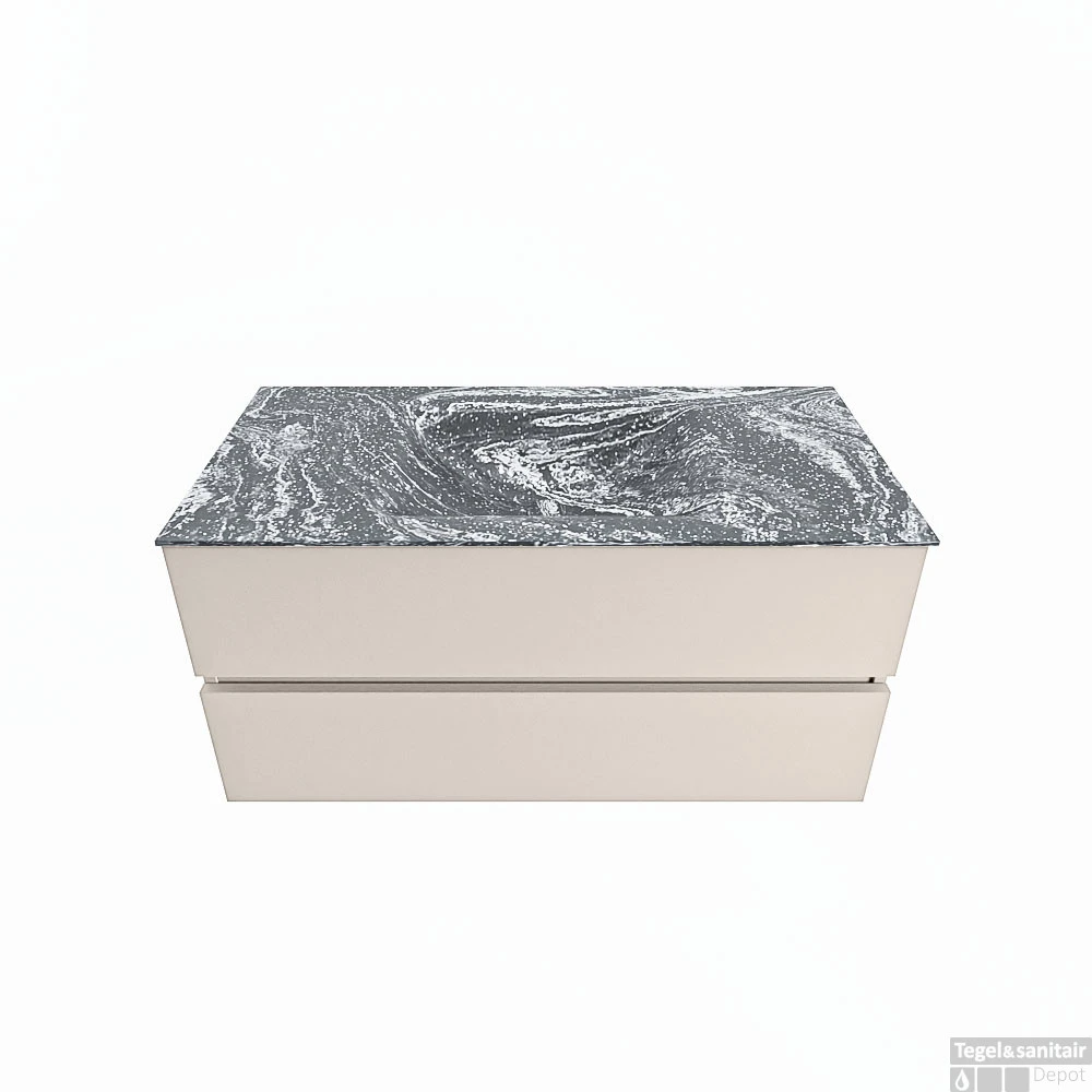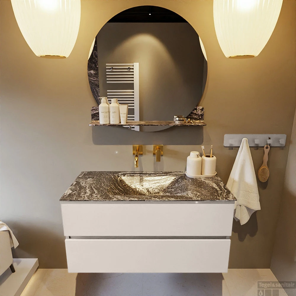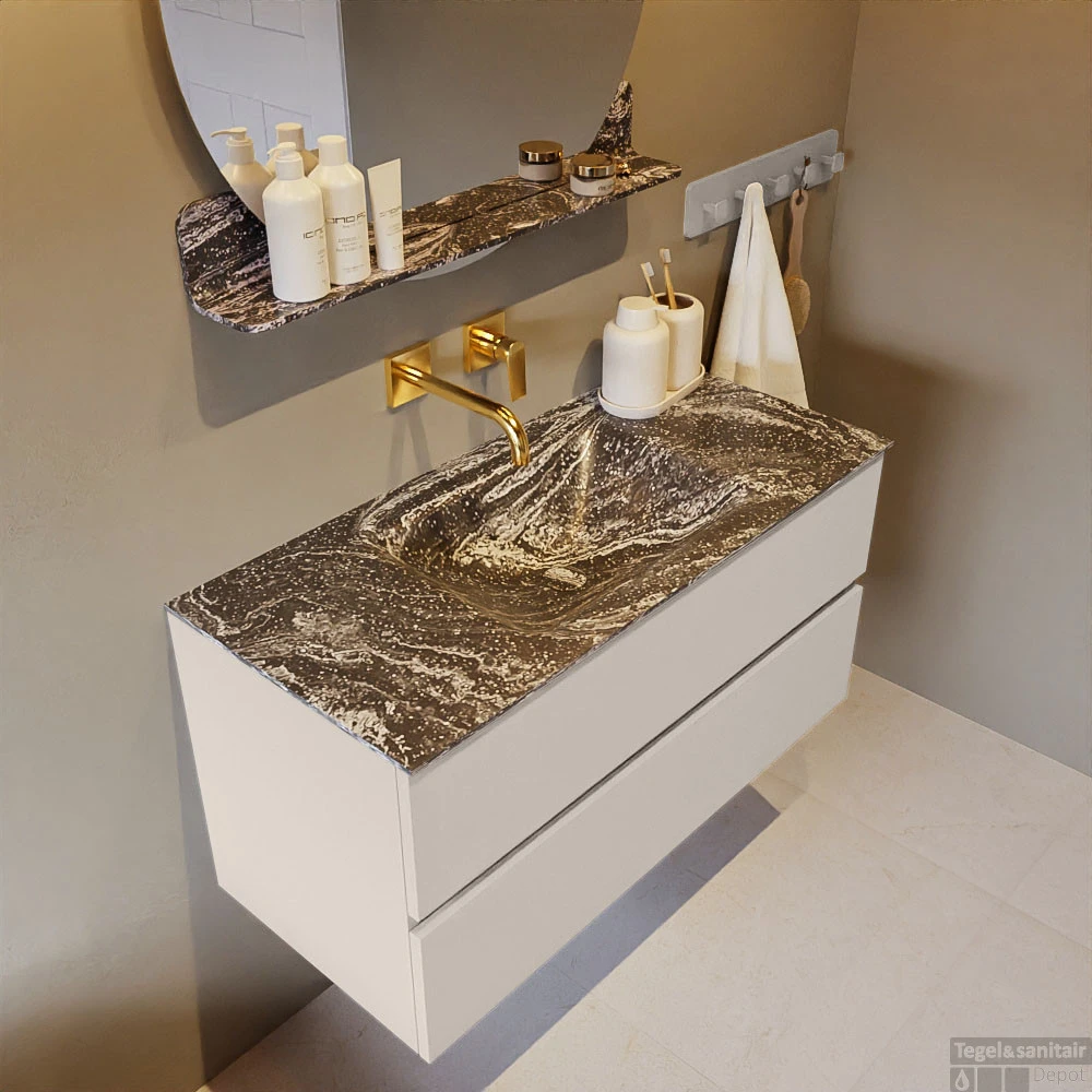 De buitengewone mooie badmeubel set VICA DLUX is een schitterend pronkstuk in uw badkamer. De gemarmerde Solid Surface wastafel van CORIAN heeft een fraaie en tijdloze uitstraling. Door de zachte en natuurlijke vorm van de wastafel, gecombineerd met de tijdloze en prachtige badmeubel onderkast past de VICA-DLUX goed bij de diverse stijlen badkamers. Om uw badkamer compleet te af te stijlen hebben wij ook de nissen en spiegelhouders in dezelfde kleur als de wastafel. Zoals de nissen en spiegel planchetten. De serie VICA DLUX bestaat uit de 2 of 4 laden onderkast VICA gecombineerd met een CORIAN Solid Surface wastafel met marmer structuur. De Solid Surface CORIAN wastafel is in 5 marmer looks verkrijgbaar. Met deze badkamermeubel set heeft u wel die mooie marmeren uitstraling maar tevens ook het gemak en de hygiëne van Solid Surface.