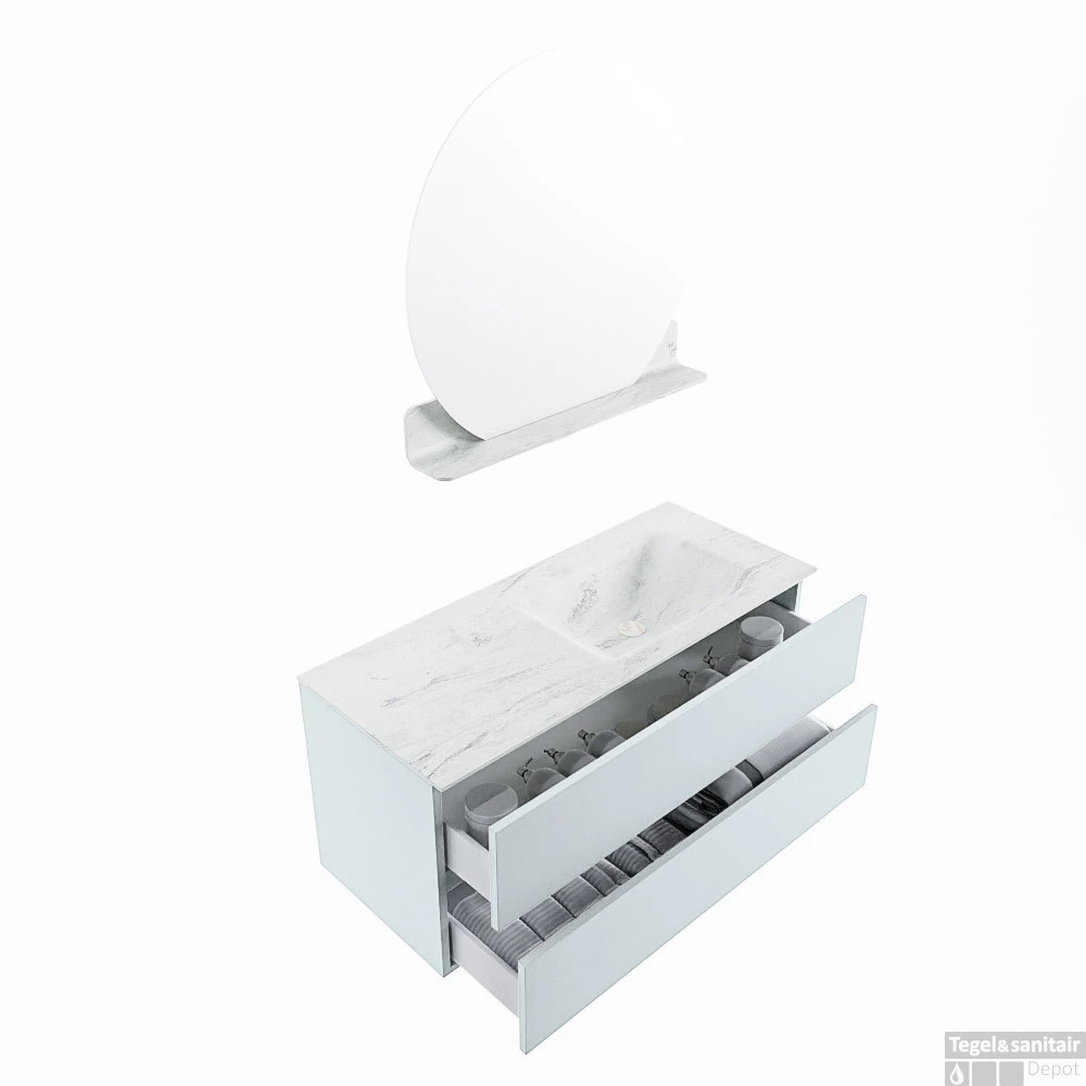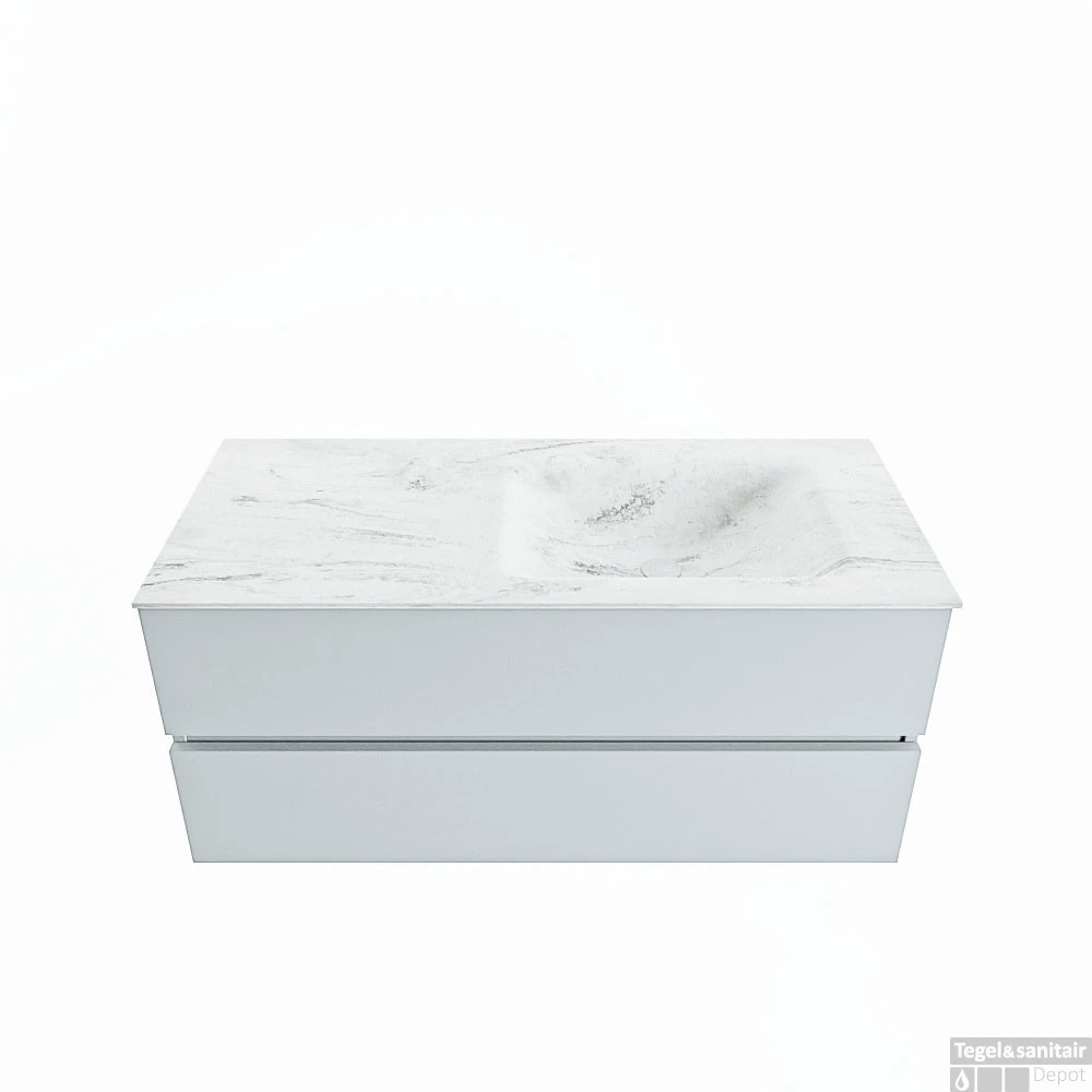 De buitengewone mooie badmeubel set VICA DLUX is een schitterend pronkstuk in uw badkamer. De gemarmerde Solid Surface wastafel van CORIAN heeft een fraaie en tijdloze uitstraling. Door de zachte en natuurlijke vorm van de wastafel, gecombineerd met de tijdloze en prachtige badmeubel onderkast past de VICA-DLUX goed bij de diverse stijlen badkamers. Om uw badkamer compleet te af te stijlen hebben wij ook de nissen en spiegelhouders in dezelfde kleur als de wastafel. Zoals de nissen en spiegel planchetten. De serie VICA DLUX bestaat uit de 2 of 4 laden onderkast VICA gecombineerd met een CORIAN Solid Surface wastafel met marmer structuur. De Solid Surface CORIAN wastafel is in 5 marmer looks verkrijgbaar. Met deze badkamermeubel set heeft u wel die mooie marmeren uitstraling maar tevens ook het gemak en de hygiëne van Solid Surface.