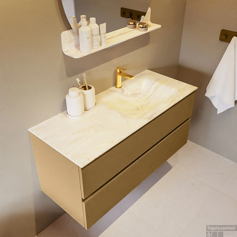 De buitengewone mooie badmeubel set VICA DLUX is een schitterend pronkstuk in uw badkamer. De gemarmerde Solid Surface wastafel van CORIAN heeft een fraaie en tijdloze uitstraling. Door de zachte en natuurlijke vorm van de wastafel, gecombineerd met de tijdloze en prachtige badmeubel onderkast past de VICA-DLUX goed bij de diverse stijlen badkamers. Om uw badkamer compleet te af te stijlen hebben wij ook de nissen en spiegelhouders in dezelfde kleur als de wastafel. Zoals de nissen en spiegel planchetten. De serie VICA DLUX bestaat uit de 2 of 4 laden onderkast VICA gecombineerd met een CORIAN Solid Surface wastafel met marmer structuur. De Solid Surface CORIAN wastafel is in 5 marmer looks verkrijgbaar. Met deze badkamermeubel set heeft u wel die mooie marmeren uitstraling maar tevens ook het gemak en de hygiëne van Solid Surface.