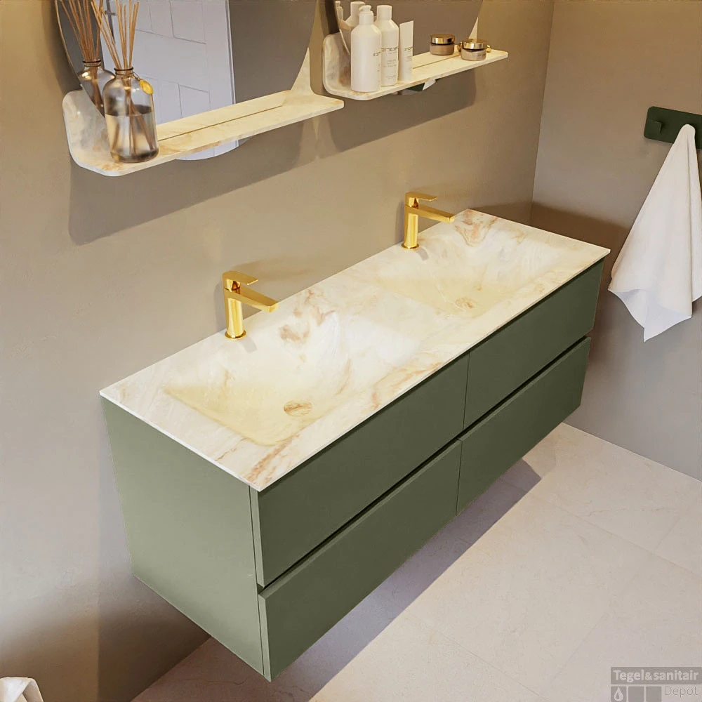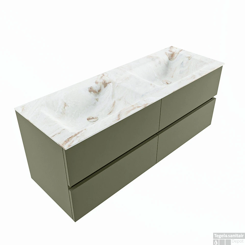 De buitengewone mooie badmeubel set VICA DLUX is een schitterend pronkstuk in uw badkamer. De gemarmerde Solid Surface wastafel van CORIAN heeft een fraaie en tijdloze uitstraling. Door de zachte en natuurlijke vorm van de wastafel, gecombineerd met de tijdloze en prachtige badmeubel onderkast past de VICA-DLUX goed bij de diverse stijlen badkamers. Om uw badkamer compleet te af te stijlen hebben wij ook de nissen en spiegelhouders in dezelfde kleur als de wastafel. Zoals de nissen en spiegel planchetten. De serie VICA DLUX bestaat uit de 2 of 4 laden onderkast VICA gecombineerd met een CORIAN Solid Surface wastafel met marmer structuur. De Solid Surface CORIAN wastafel is in 5 marmer looks verkrijgbaar. Met deze badkamermeubel set heeft u wel die mooie marmeren uitstraling maar tevens ook het gemak en de hygiëne van Solid Surface.