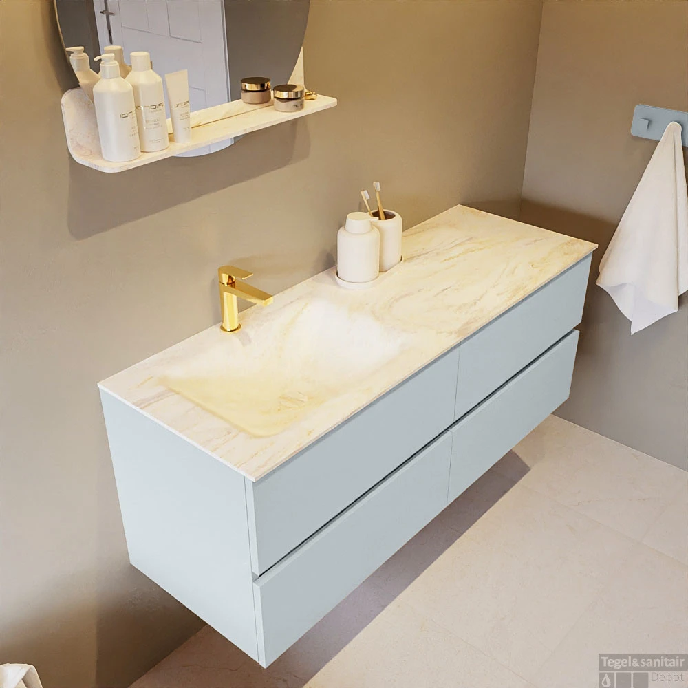 De buitengewone mooie badmeubel set VICA DLUX is een schitterend pronkstuk in uw badkamer. De gemarmerde Solid Surface wastafel van CORIAN heeft een fraaie en tijdloze uitstraling. Door de zachte en natuurlijke vorm van de wastafel, gecombineerd met de tijdloze en prachtige badmeubel onderkast past de VICA-DLUX goed bij de diverse stijlen badkamers. Om uw badkamer compleet te af te stijlen hebben wij ook de nissen en spiegelhouders in dezelfde kleur als de wastafel. Zoals de nissen en spiegel planchetten. De serie VICA DLUX bestaat uit de 2 of 4 laden onderkast VICA gecombineerd met een CORIAN Solid Surface wastafel met marmer structuur. De Solid Surface CORIAN wastafel is in 5 marmer looks verkrijgbaar. Met deze badkamermeubel set heeft u wel die mooie marmeren uitstraling maar tevens ook het gemak en de hygiëne van Solid Surface.