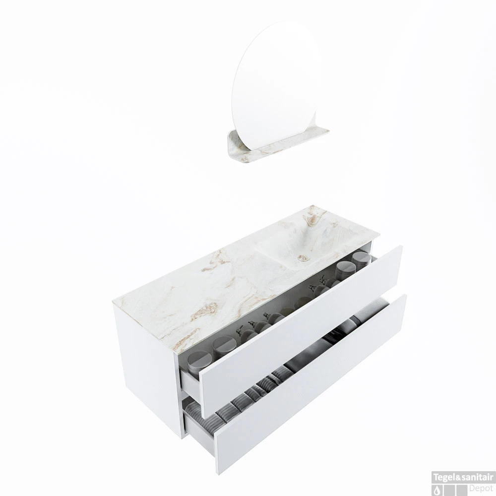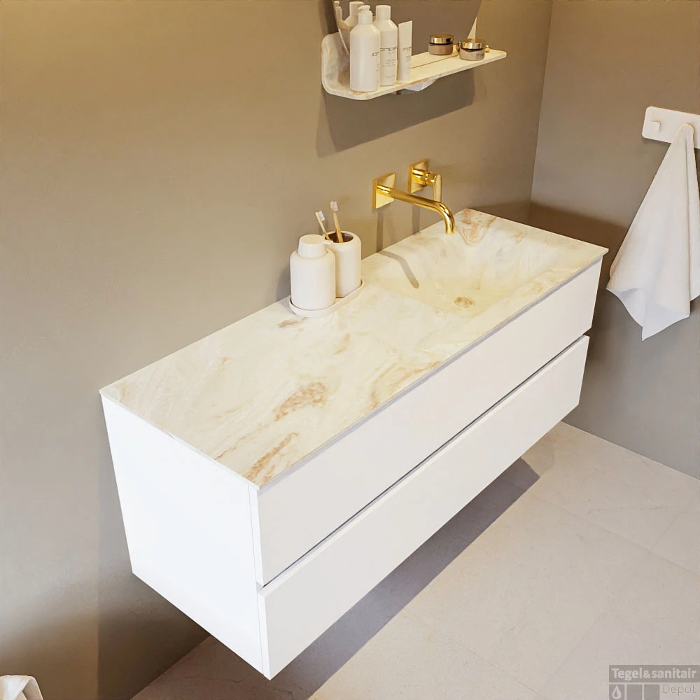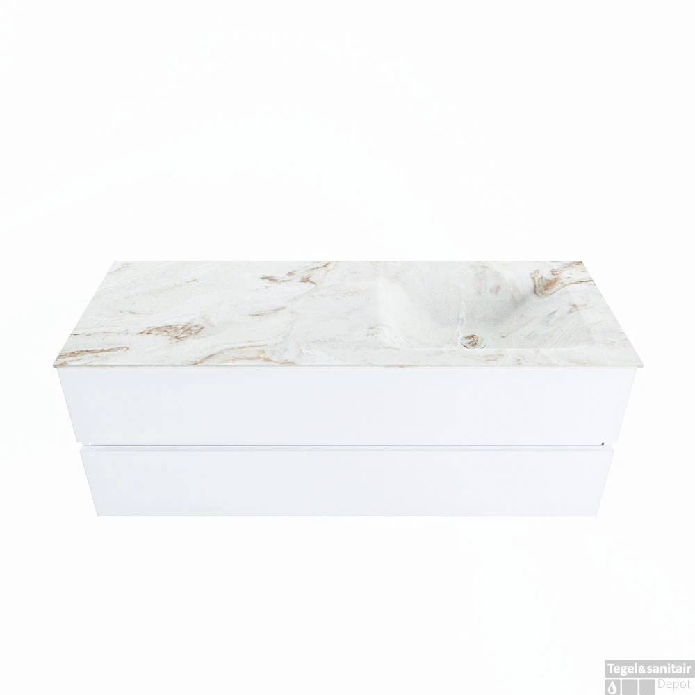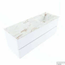 De buitengewone mooie badmeubel set VICA DLUX is een schitterend pronkstuk in uw badkamer. De gemarmerde Solid Surface wastafel van CORIAN heeft een fraaie en tijdloze uitstraling. Door de zachte en natuurlijke vorm van de wastafel, gecombineerd met de tijdloze en prachtige badmeubel onderkast past de VICA-DLUX goed bij de diverse stijlen badkamers. Om uw badkamer compleet te af te stijlen hebben wij ook de nissen en spiegelhouders in dezelfde kleur als de wastafel. Zoals de nissen en spiegel planchetten. De serie VICA DLUX bestaat uit de 2 of 4 laden onderkast VICA gecombineerd met een CORIAN Solid Surface wastafel met marmer structuur. De Solid Surface CORIAN wastafel is in 5 marmer looks verkrijgbaar. Met deze badkamermeubel set heeft u wel die mooie marmeren uitstraling maar tevens ook het gemak en de hygiëne van Solid Surface.