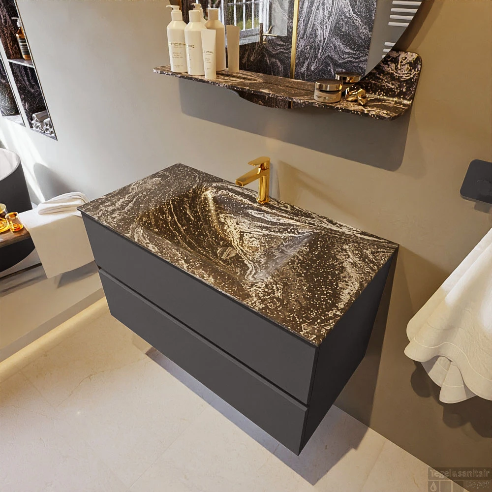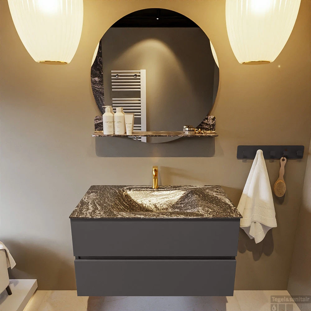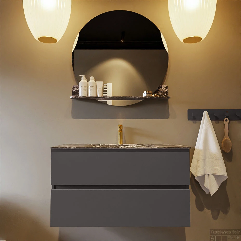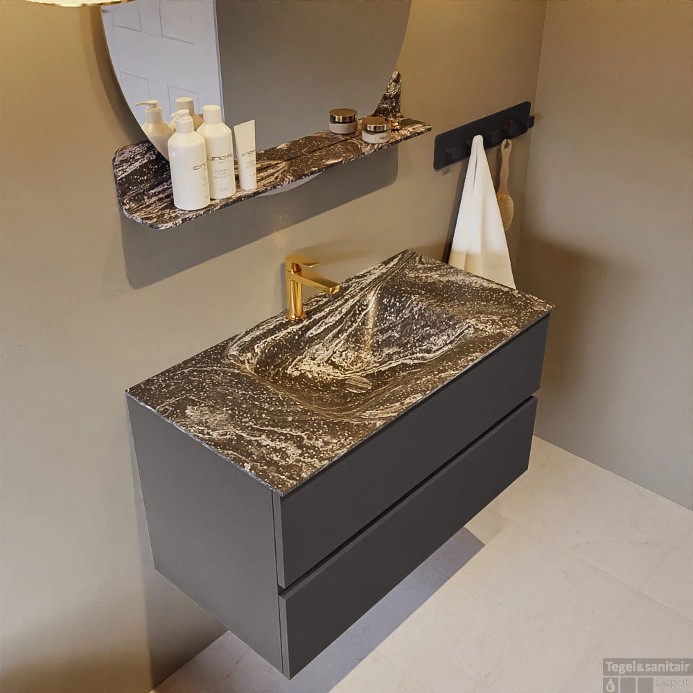 De buitengewone mooie badmeubel set VICA DLUX is een schitterend pronkstuk in uw badkamer. De gemarmerde Solid Surface wastafel van CORIAN heeft een fraaie en tijdloze uitstraling. Door de zachte en natuurlijke vorm van de wastafel, gecombineerd met de tijdloze en prachtige badmeubel onderkast past de VICA-DLUX goed bij de diverse stijlen badkamers. Om uw badkamer compleet te af te stijlen hebben wij ook de nissen en spiegelhouders in dezelfde kleur als de wastafel. Zoals de nissen en spiegel planchetten. De serie VICA DLUX bestaat uit de 2 of 4 laden onderkast VICA gecombineerd met een CORIAN Solid Surface wastafel met marmer structuur. De Solid Surface CORIAN wastafel is in 5 marmer looks verkrijgbaar. Met deze badkamermeubel set heeft u wel die mooie marmeren uitstraling maar tevens ook het gemak en de hygiëne van Solid Surface.