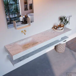 MONDIAZ AIVY 120cm Badmeubel Talc, Wastafel Talc Solid Surface Dubbel 2 Kraangaten Met Spiegelkast